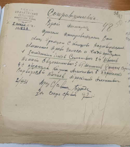 Если кто вдруг будет работать с делами лишенцев, смотрите не только само дело, но и обложку. Там всякие полезные резолюции. Вот тут резолюция "Выслать", а в самом деле про высылку ни слова. Так бывает нередко. Помню, в Саянском архиве на некоторых делах на обложке было крупно написано "Дворец". Только через пару сотен дел я сообразил, что эти семьи высланы в п. Дворец Кежемского района. Но в самих делах об этом, как правило, ничего не было, только когда я наткнулся на заявление, написанное в этом самом Дворце, понял, что к чему. Пришлось пересматривать все дела заново (точнее, из обложки)