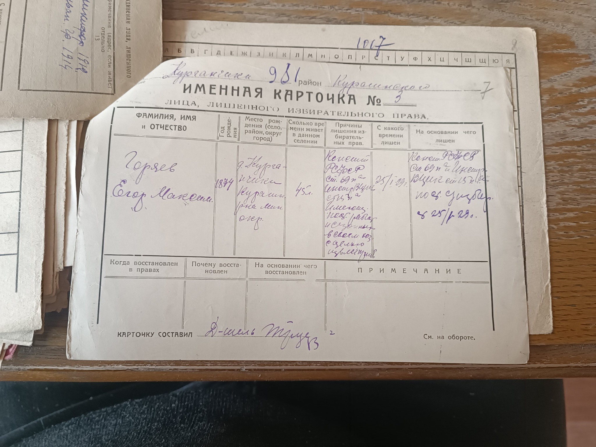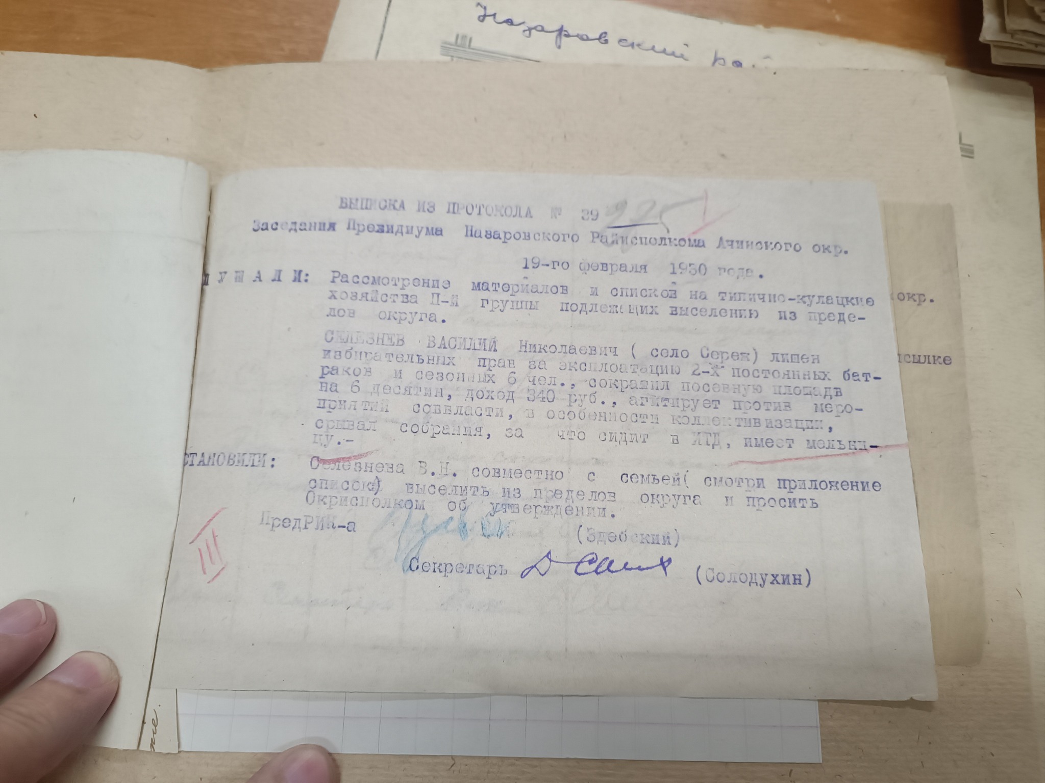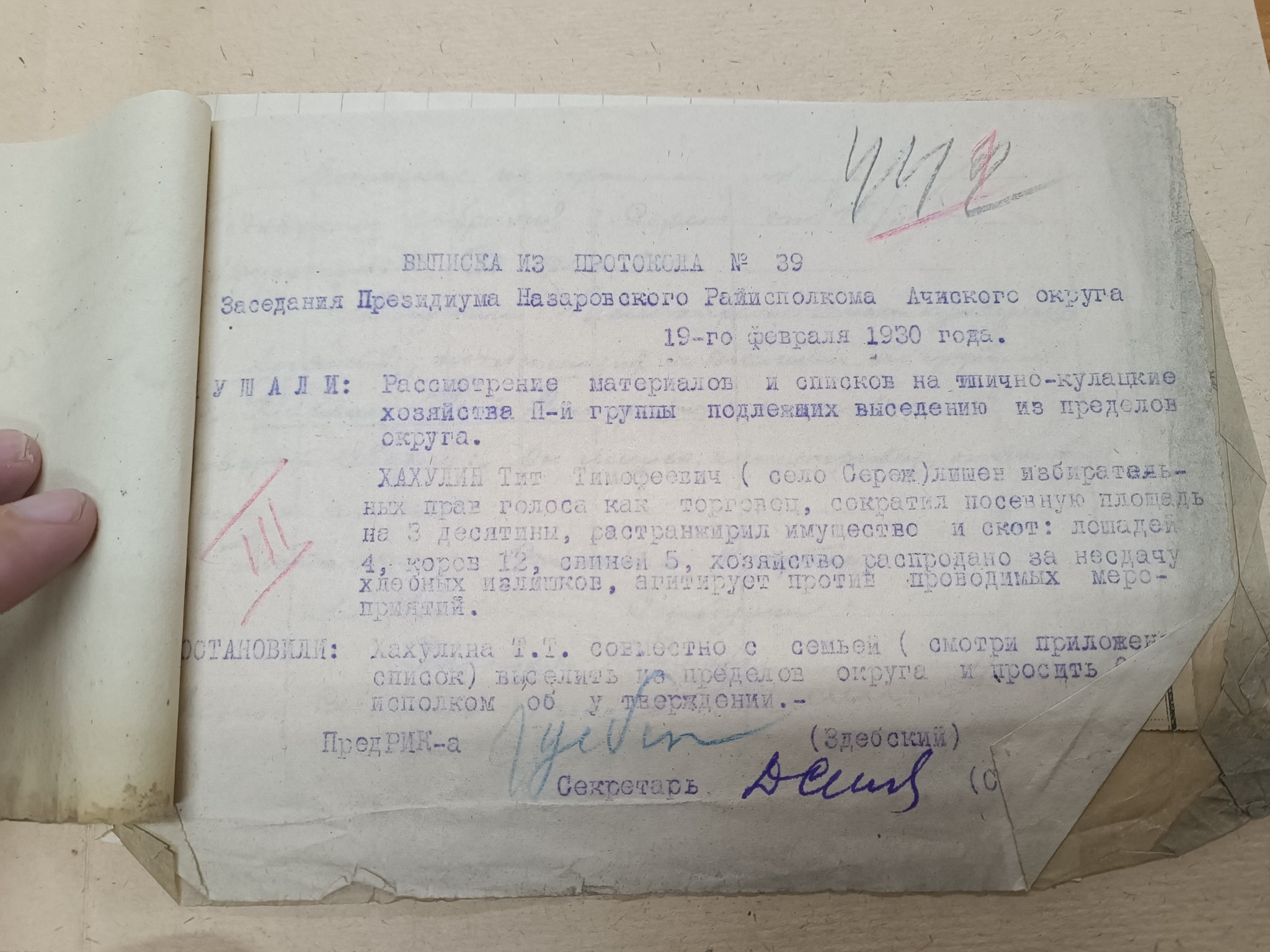 Так что, работая с делами лишенцев в курагинском архиве, все время натыкался на фамилии своих одноклассников. И, как и ожидал, в делах Курского сельсовета встретил дело прадеда моей школьной любви.