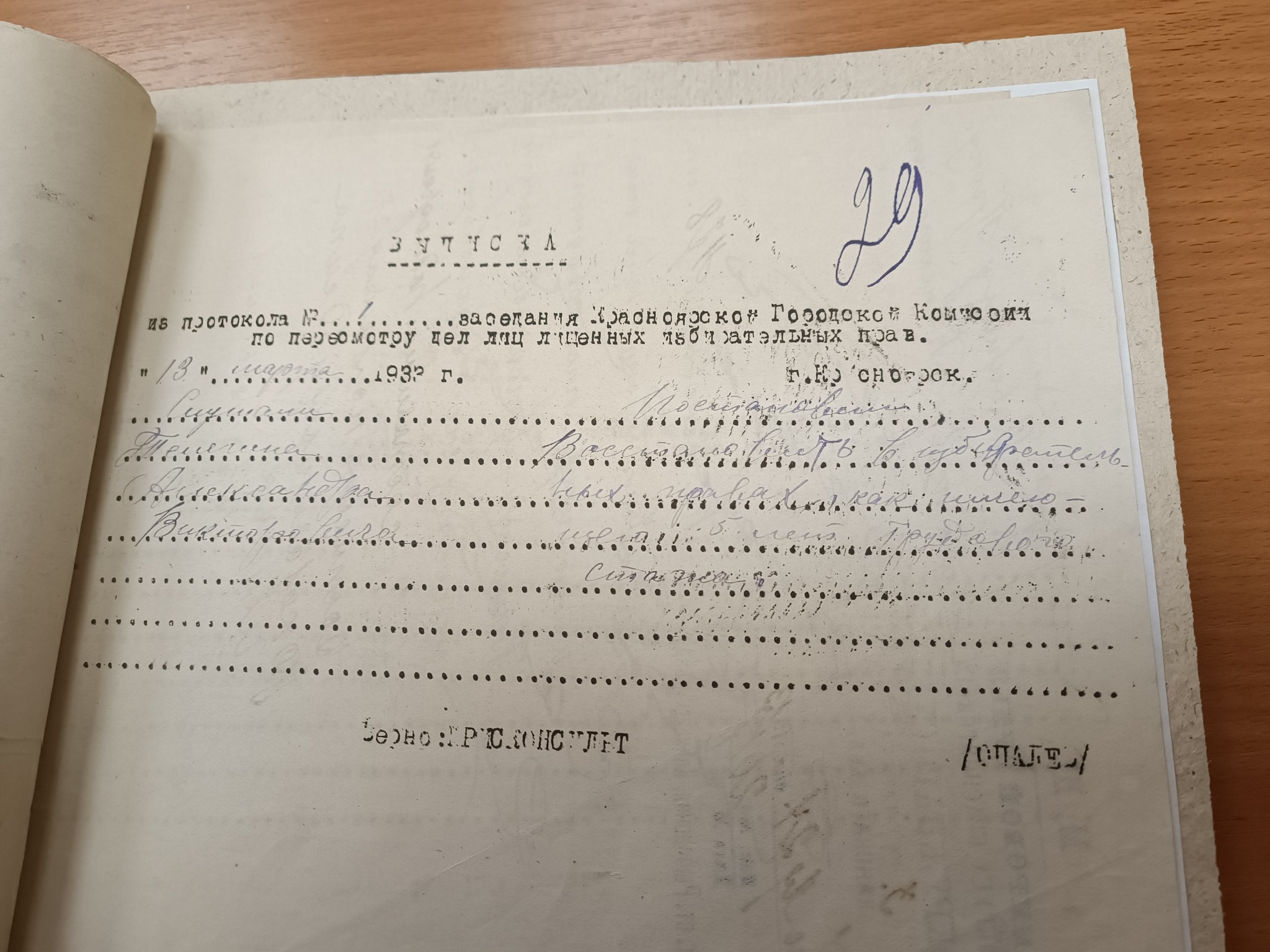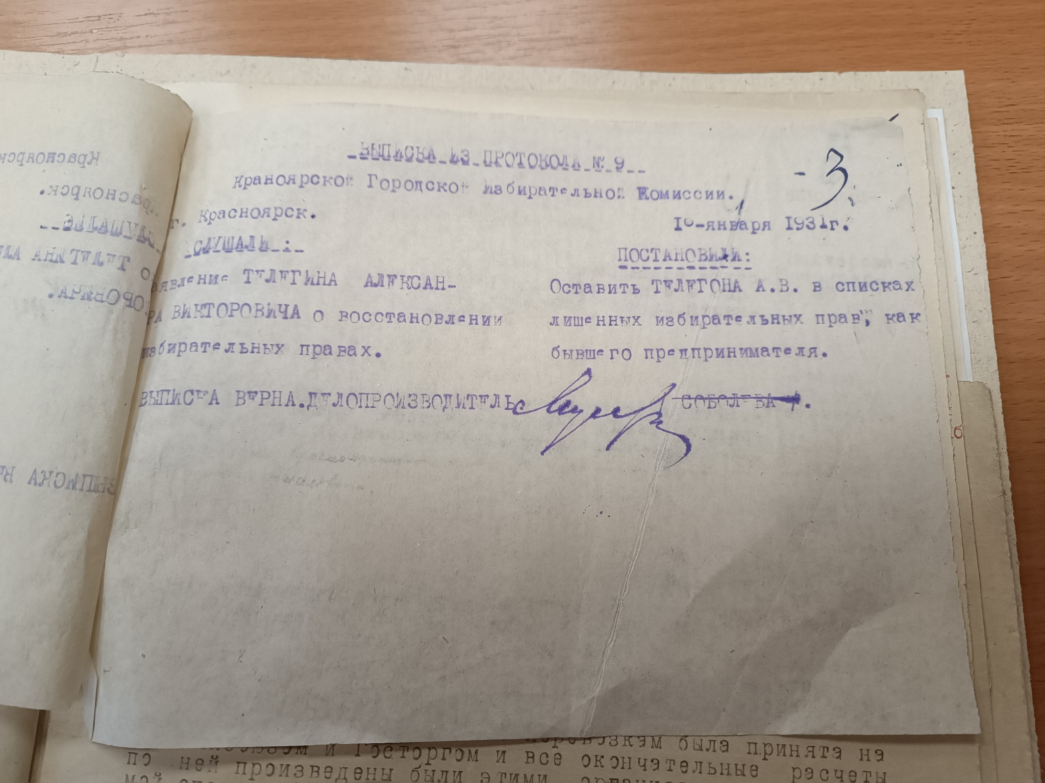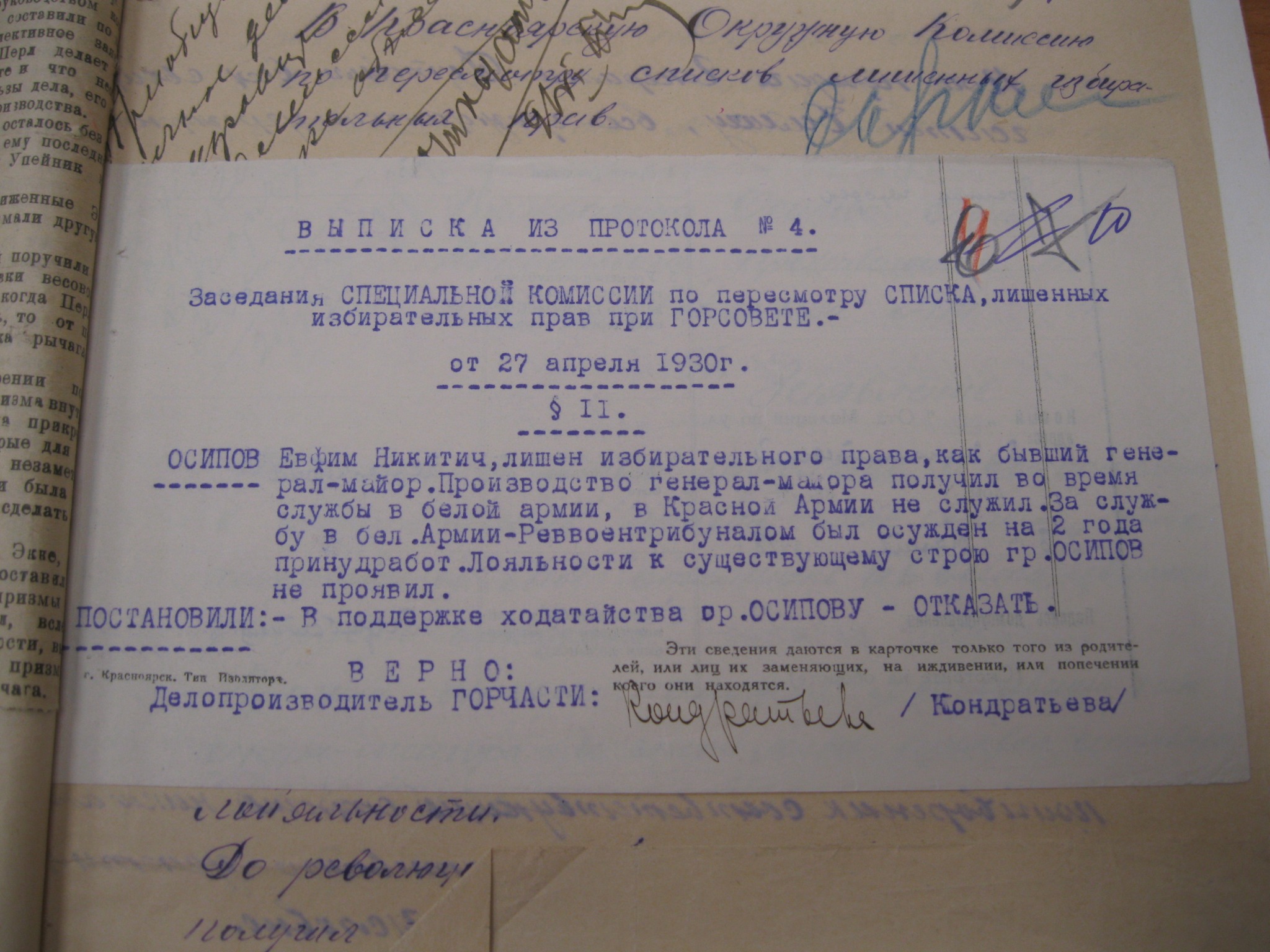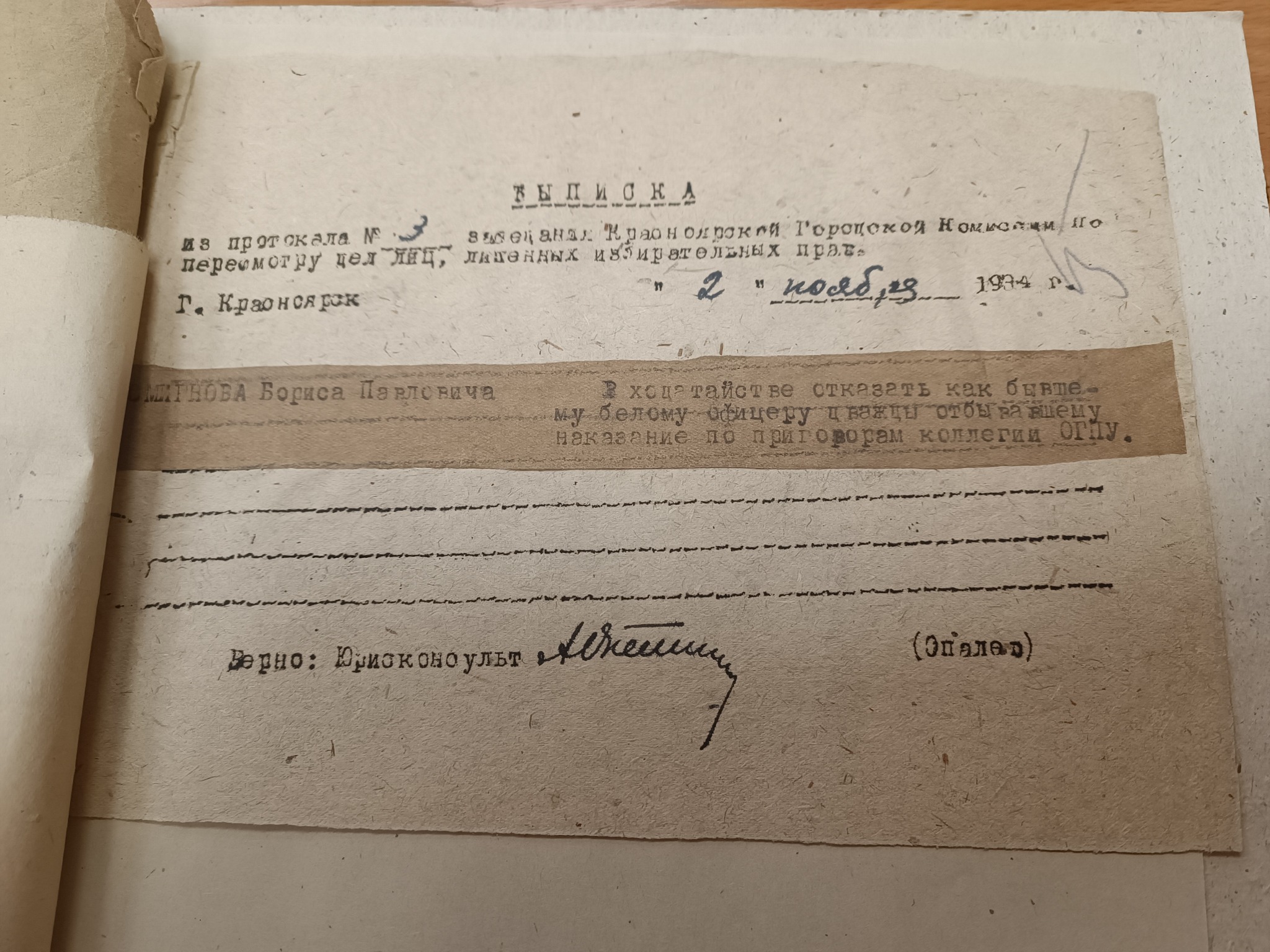 Для начала - выписка из решения Рыбинского исполкома лежит в деле уярского лишенца. Такое бывает.