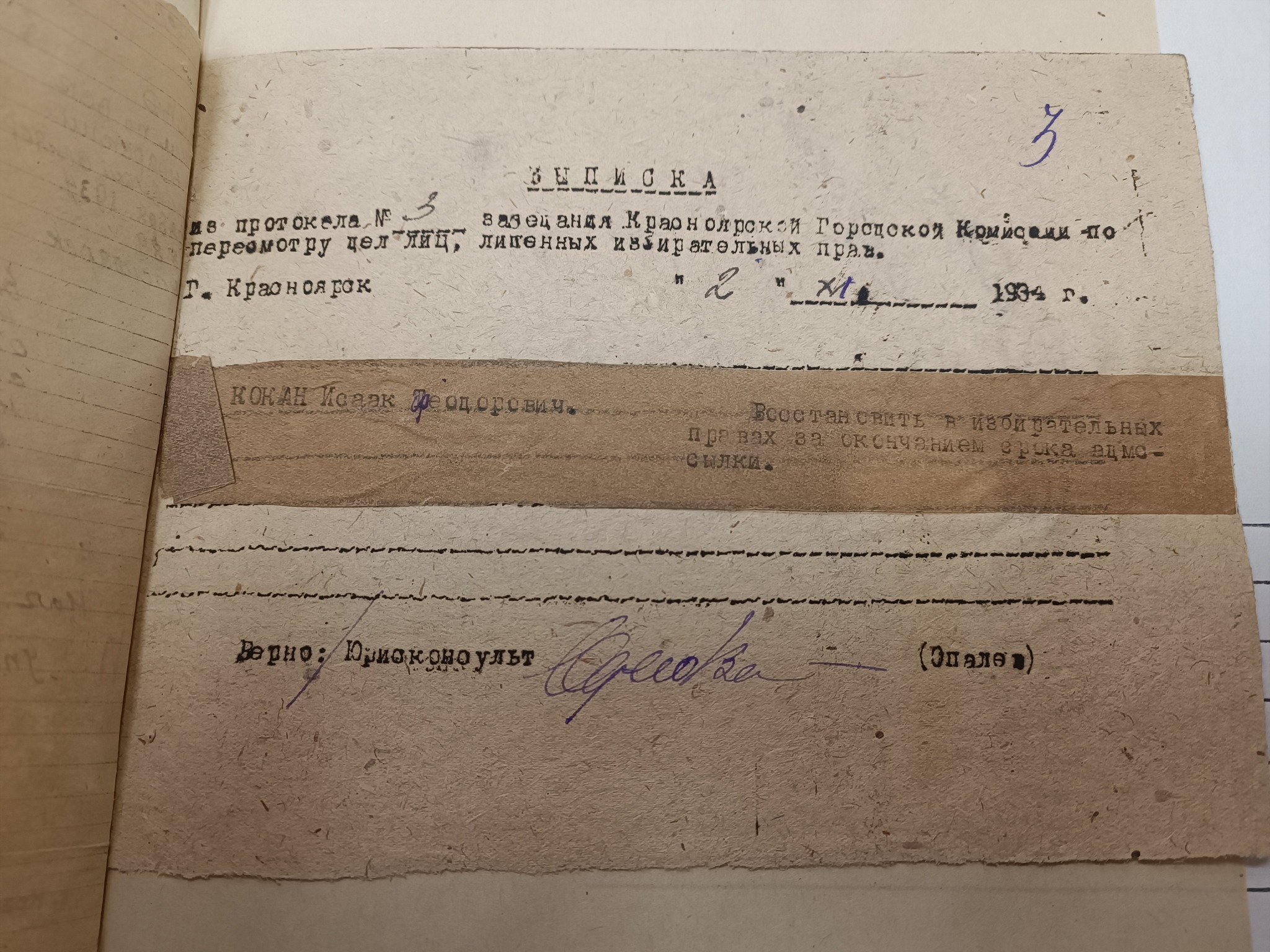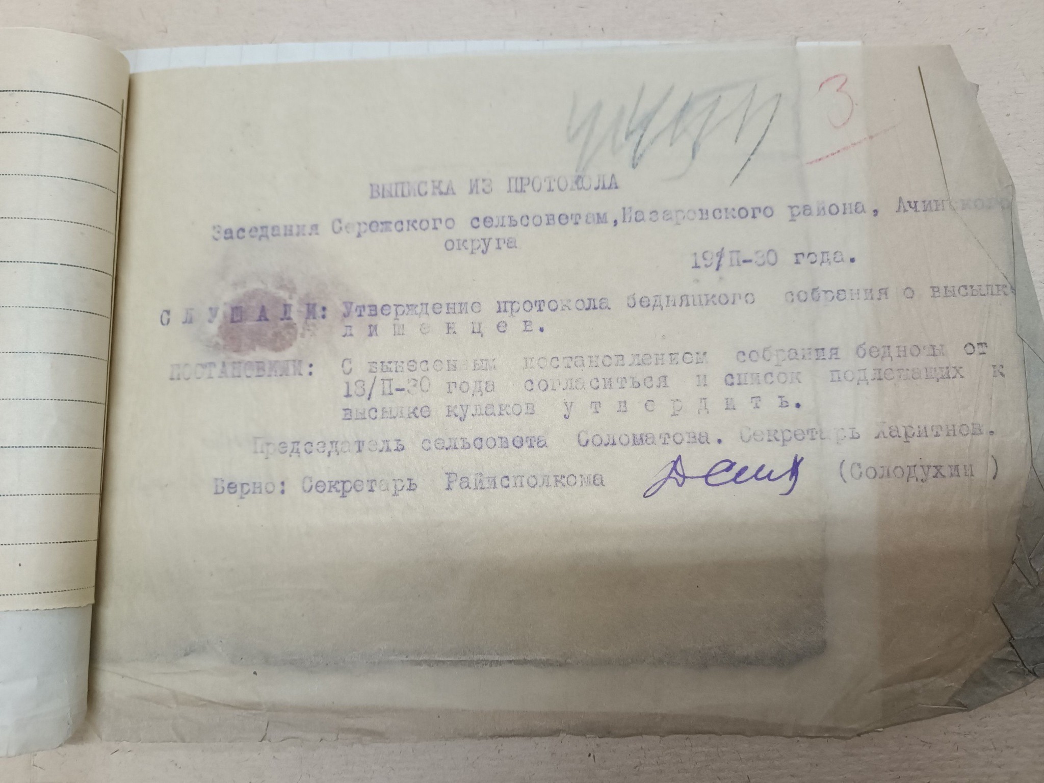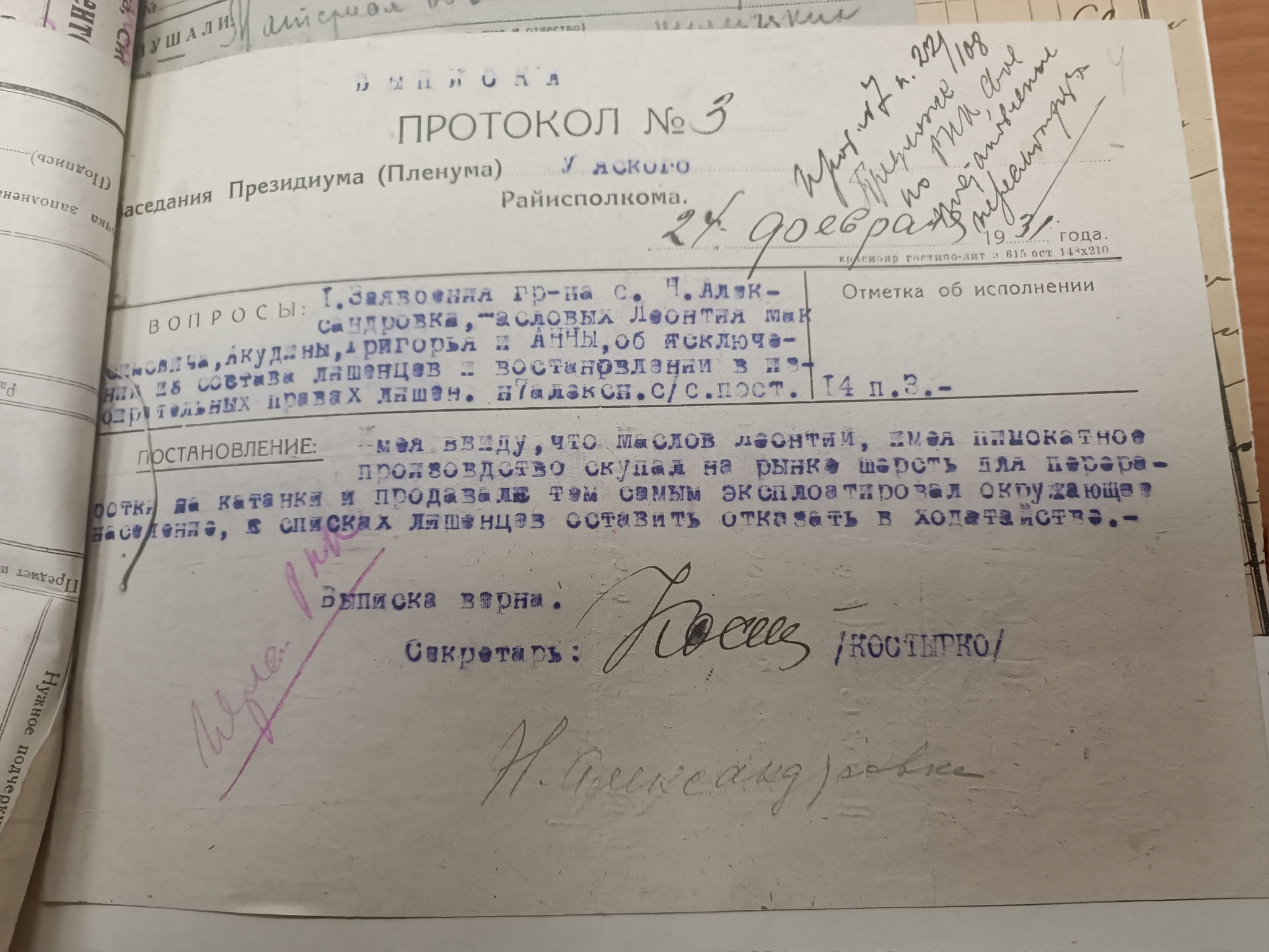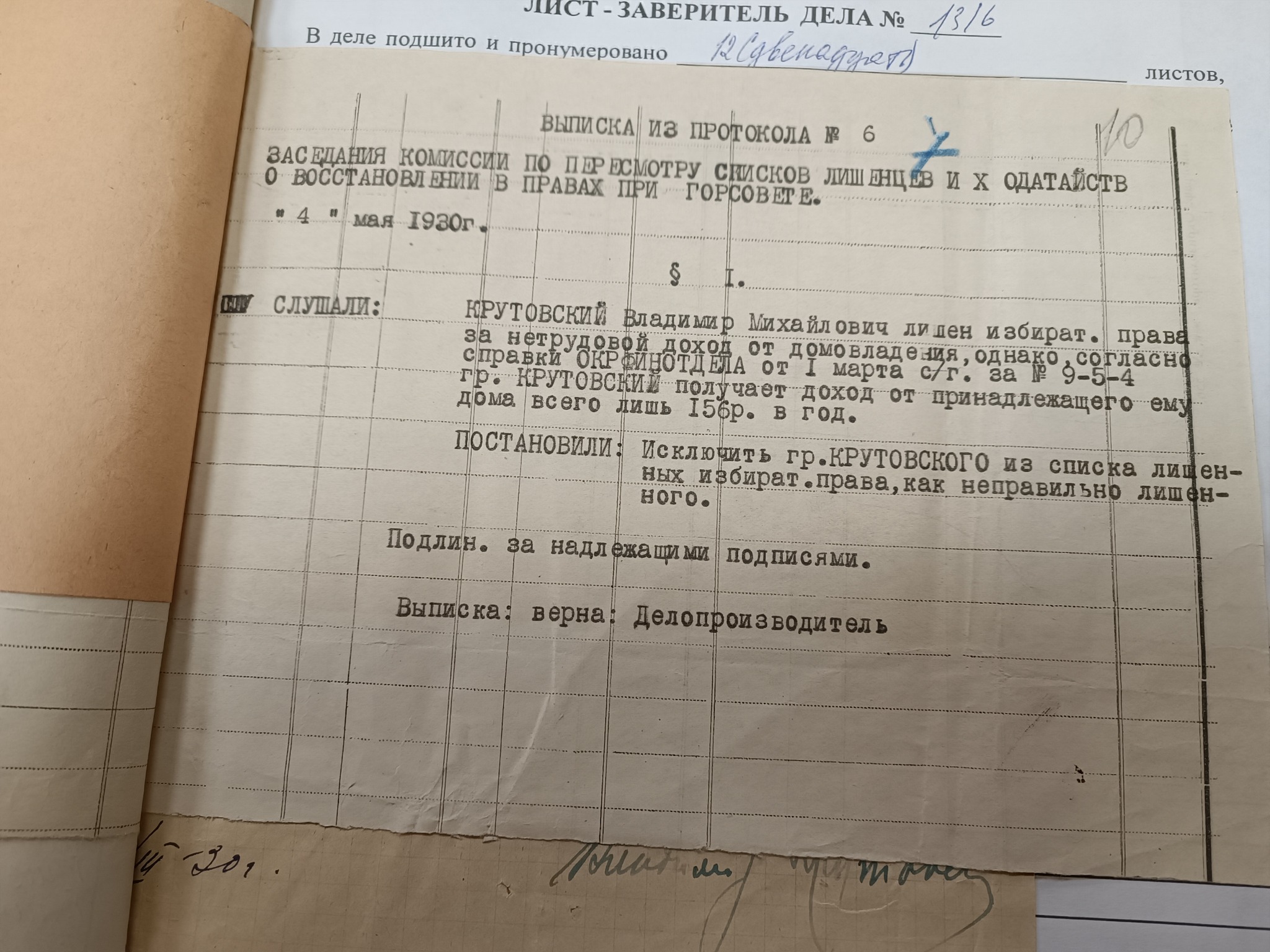 Для начала - выписка из решения Рыбинского исполкома лежит в деле уярского лишенца. Такое бывает.
