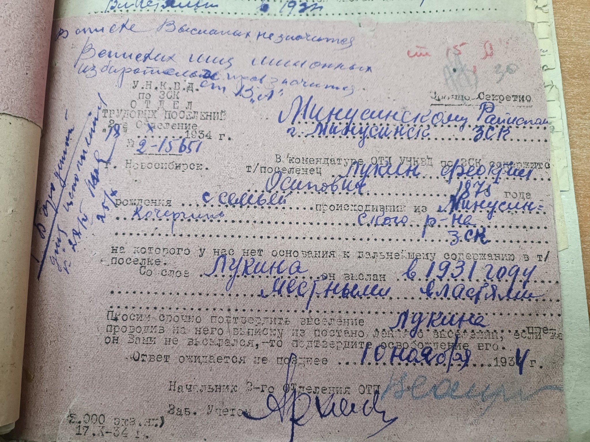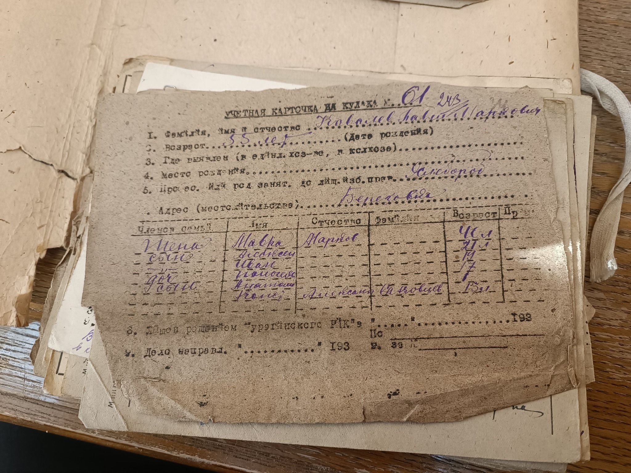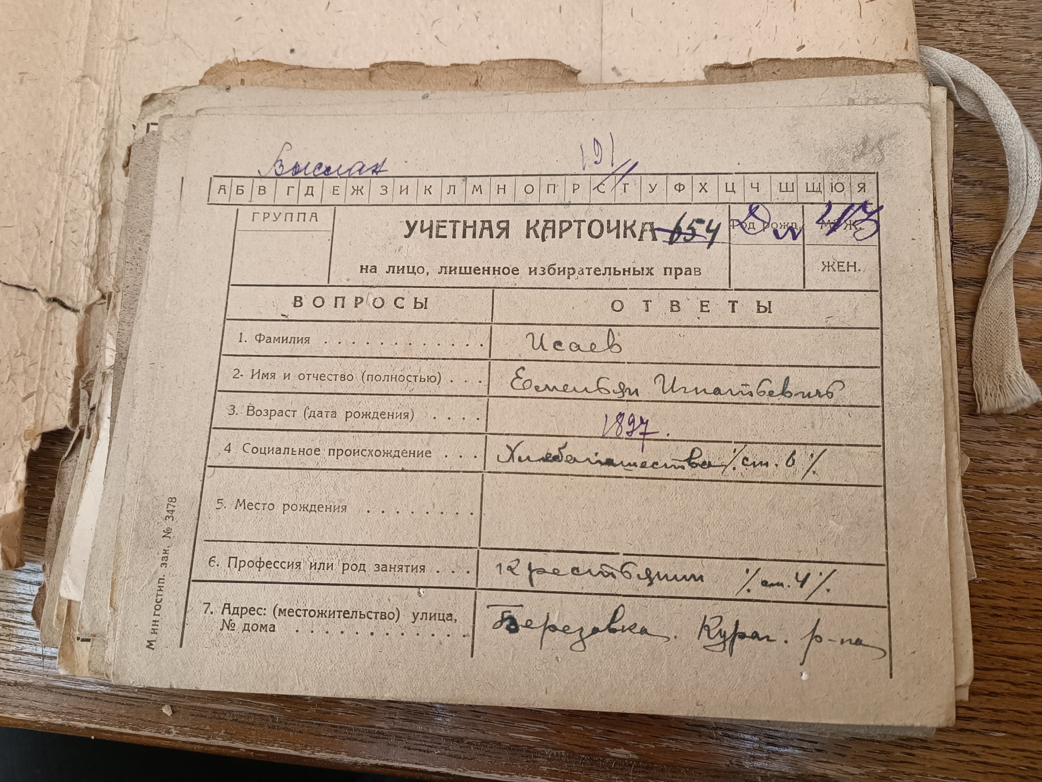 Ещё одна семья, высланная из Казахстана в Уярский район. Совпадение? Не думаю (с). Даже Володя Биргер, описавший все ссыльные потоки в Красноярском крае, об этом не знал. И любопытно, что они прибыли сюда прямо с делом лишенца, то есть на родине в Кокчетавском фонде лишенцев этого дела нет.