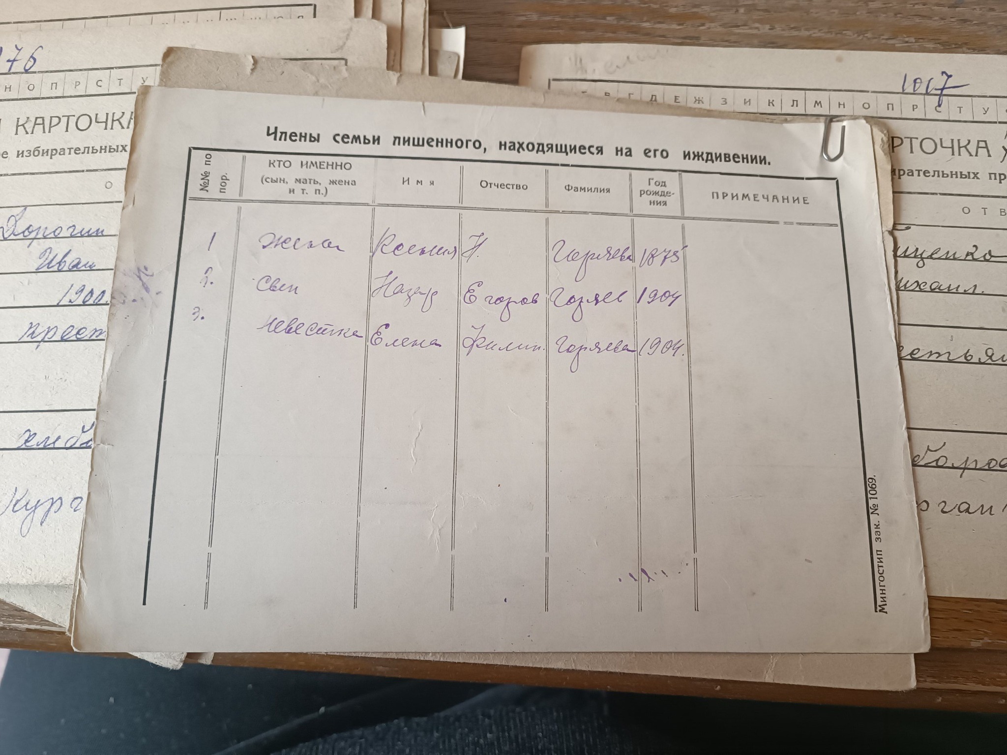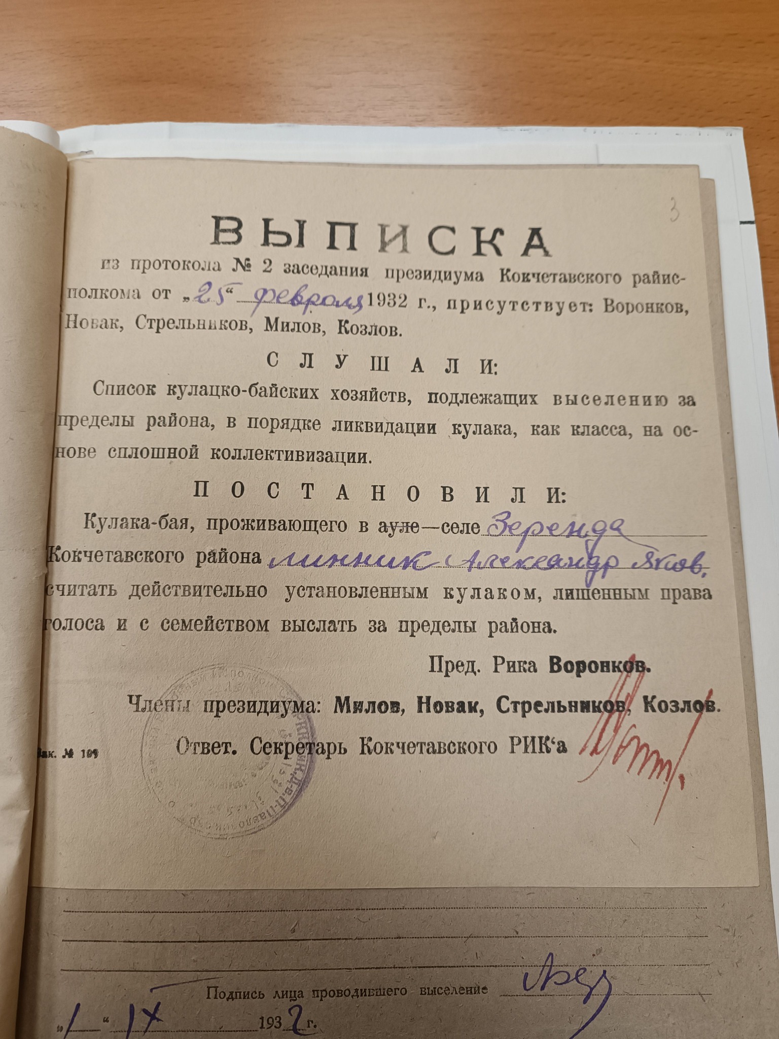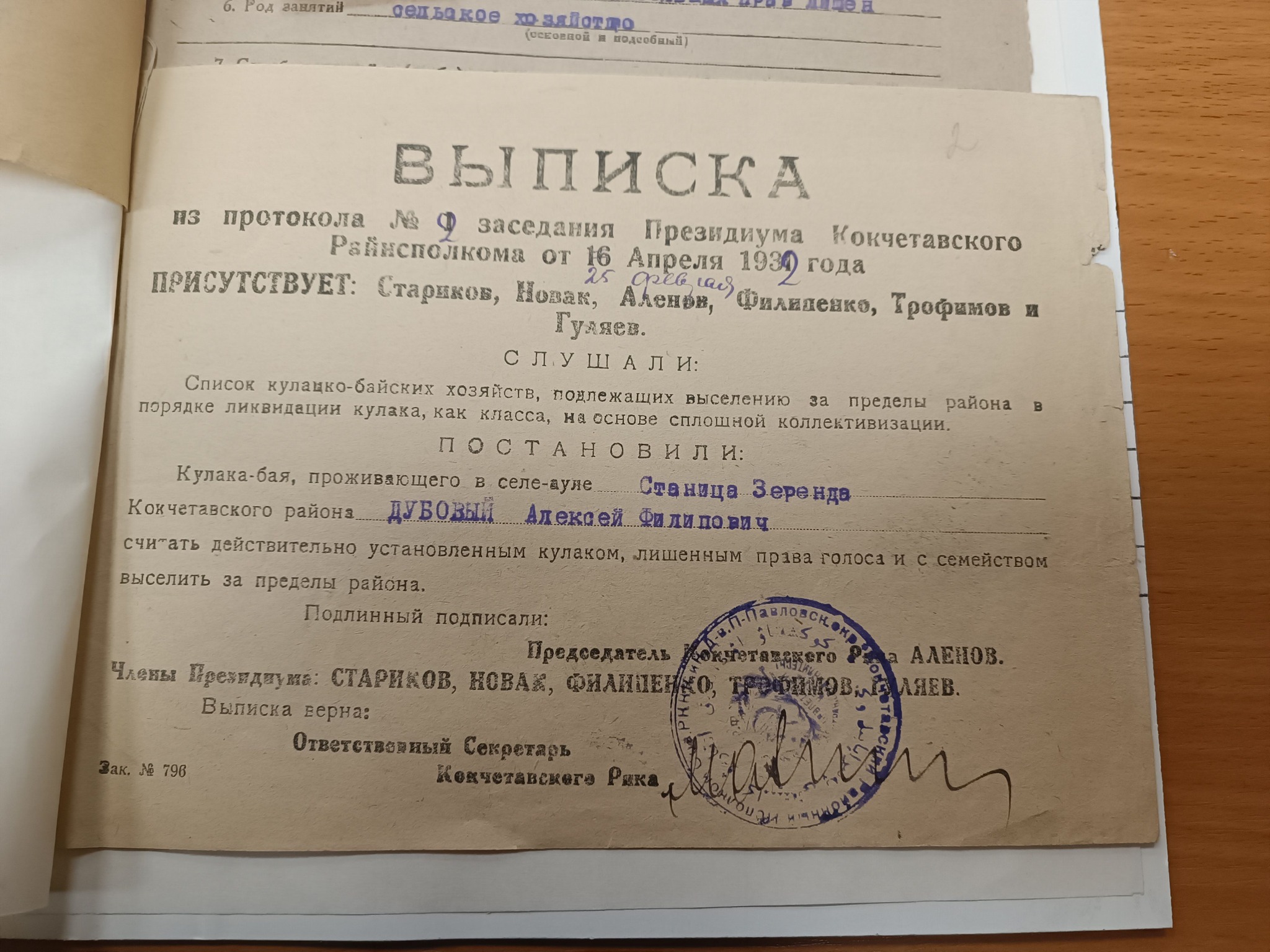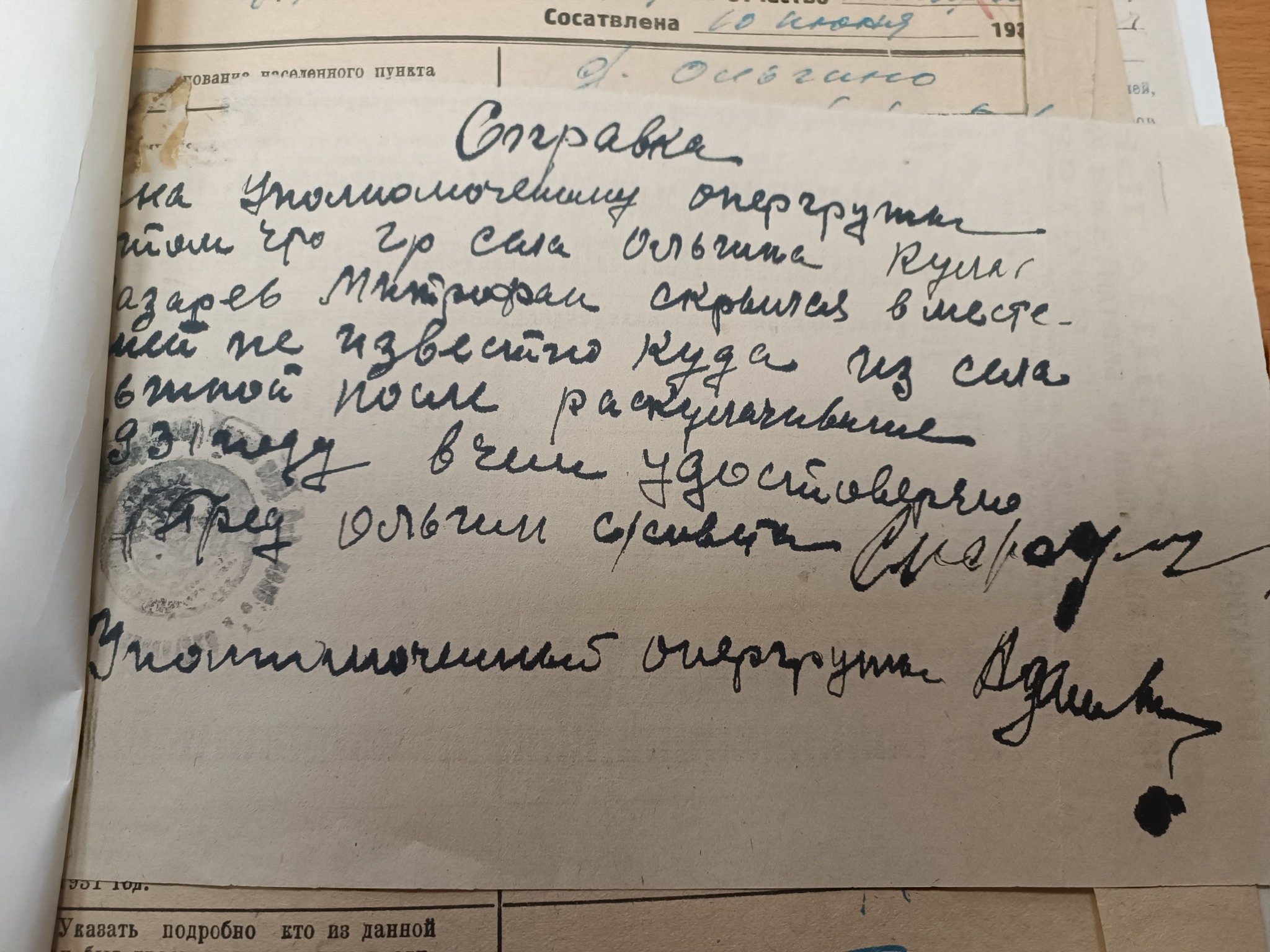 Ещё одна семья, высланная из Казахстана в Уярский район. Совпадение? Не думаю (с). Даже Володя Биргер, описавший все ссыльные потоки в Красноярском крае, об этом не знал. И любопытно, что они прибыли сюда прямо с делом лишенца, то есть на родине в Кокчетавском фонде лишенцев этого дела нет.