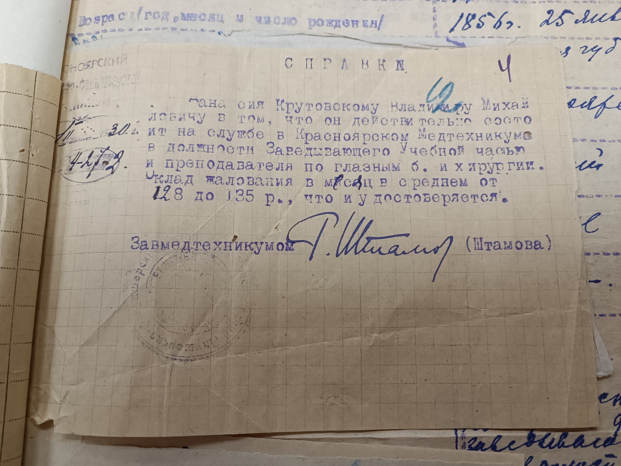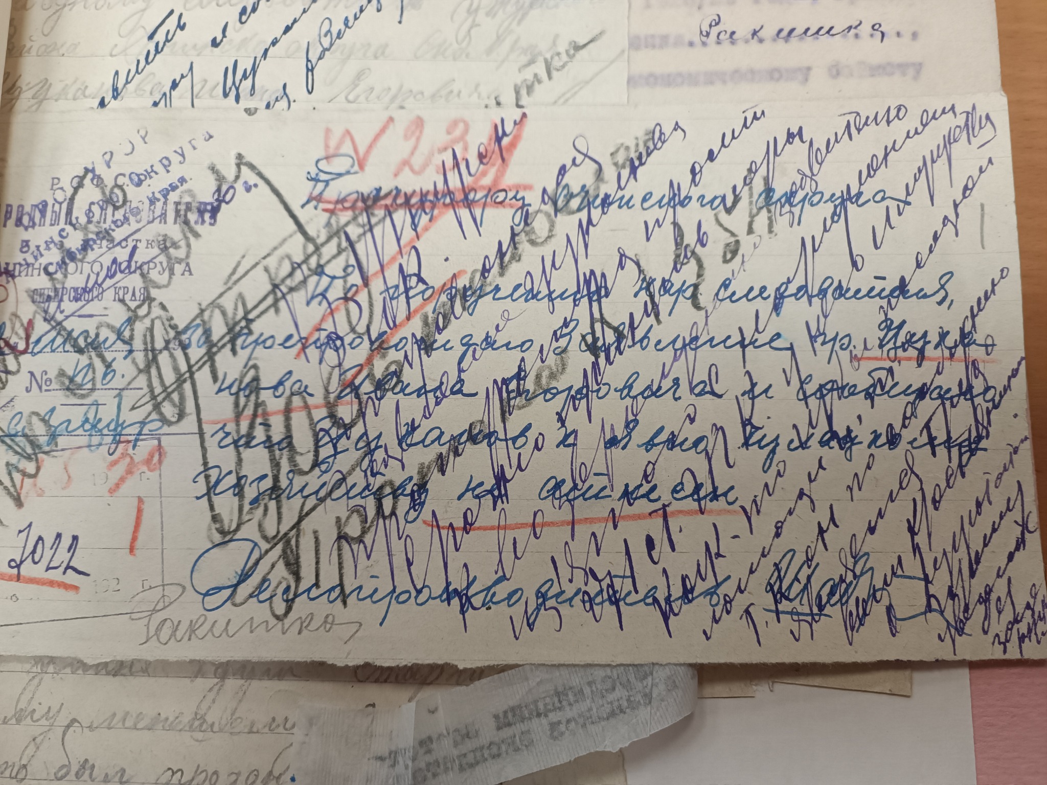 А в Восточно-Сибирском крае - довольно жёсткая стандартизация, единые для всех районов бланки документов, напечатанные в типографии в Иркутске. Однако это единообразие однажды сыграло злую шутку: было издано гигантское количество бланков с одной-единственной опечаткой, но какой! Вместо слова ОБСЛЕДОВАНИЕ напечатано ОБСЛУЖИВАНИЕ. Не знаю, что стало с теми, кто эту ошибку допустил, но надеюсь, что дело ограничилось увольнением - на дворе было всё-таки начало тридцатых, а не конец. Но бланки пустили в работу, а дальше - кто-то замазывал это слово и писал сверху правильное, кто-то просто замазывал, а кто-то ничего не делал и заполнял бланки как есть. Ну, вот как это нередко делалось в Кежме: