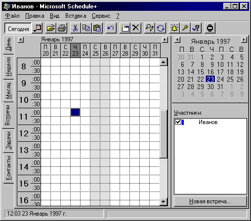 Упражнение. Назначьте встречу с кем-либо в этот же день: через полчаса: с оповещением за пятнадцать минут. Не поняли? Например: сейчас 23 января, 12.20. Назначьте встречу на 12.50, с оповещением за 15 минут до начала. И продолжайте изучение Schedule+.