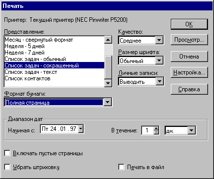 Казалось бы, все просто. Выбираете Файл Печать и - поехали. Но все дело в том, что существует масса возможностей печати: выбор шрифтов, и формат бумаги (можно печатать прямо в том виде, в каком список дел бывает в обычном органайзере).